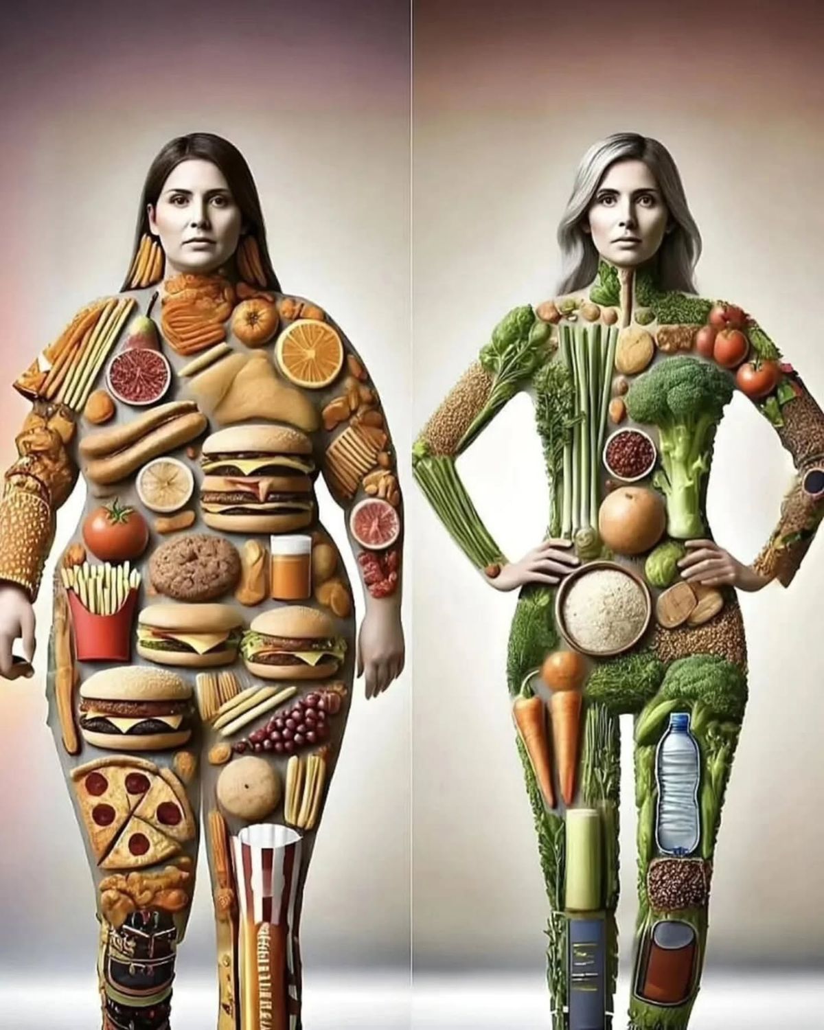 Na zdjęciu widoczny jest uderzający kontrast: z jednej strony dieta bogata w produkty wysoko przetworzone (fast food, potrawy smażone, ciastka), a z drugiej strony dieta składająca się głównie z warzyw, owoców, produktów pełnoziarnistych i wody.