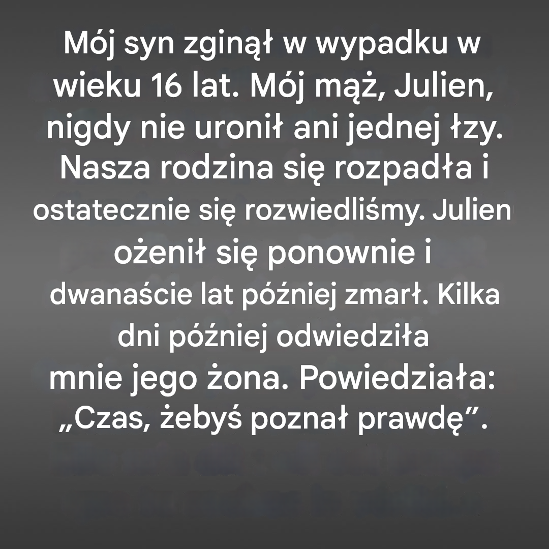 Dwanaście lat później dowiedziałem się o jego nagłej śmierci. Wbrew wszelkim przeciwnościom, ogarnął mnie smutek. Kilka dni po ceremonii ktoś zapukał do moich drzwi: jego druga żona. Drżącym głosem powiedziała mi po prostu, że jest coś, co muszę wiedzieć.