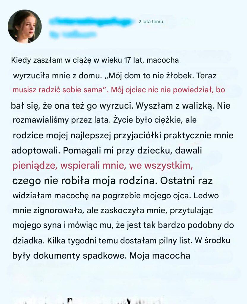 Macocha nie płakała. Nie pytała, czy się boję, ani co mi chodzi po głowie. Skrzyżowała ramiona, spojrzała na mój brzuch, jakby był plamą na jej uporządkowanym życiu, a potem powiedziała: „Ten dom to nie kołyska. Musisz radzić sobie sama”.
