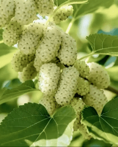 Owoce morwy białej przypominają kształtem jeżyny, ale mają jaśniejszy kolor – biały lub kremowy, czasem lekko żółtawy. Są delikatne, soczyste i bardzo słodkie w smaku. Dojrzałe owoce można jeść na surowo lub suszyć, dzięki czemu zachowują swoje właściwości na dłużej.