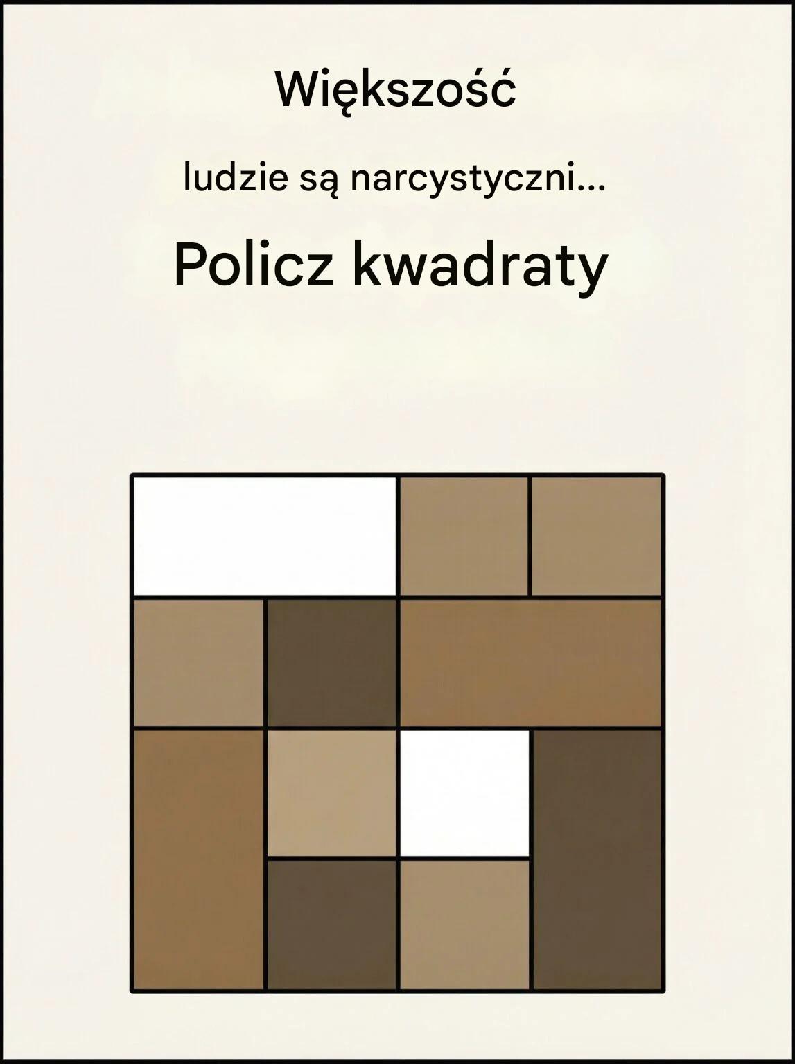 Oryginalny przekaz obrazka jest prowokacyjny: sugeruje, że osoby, które nie widzą jasno rozwiązania lub nie podchodzą do zadania w określony sposób, mogą być podatne na narcystyczne i egocentryczne myślenie. Oczywiście nie jest to pomiar naukowy, a raczej zabawny i stymulujący test osobowości. Może jednak być interesujące, co Twoje podejście do tego rysunku mówi o Tobie.
