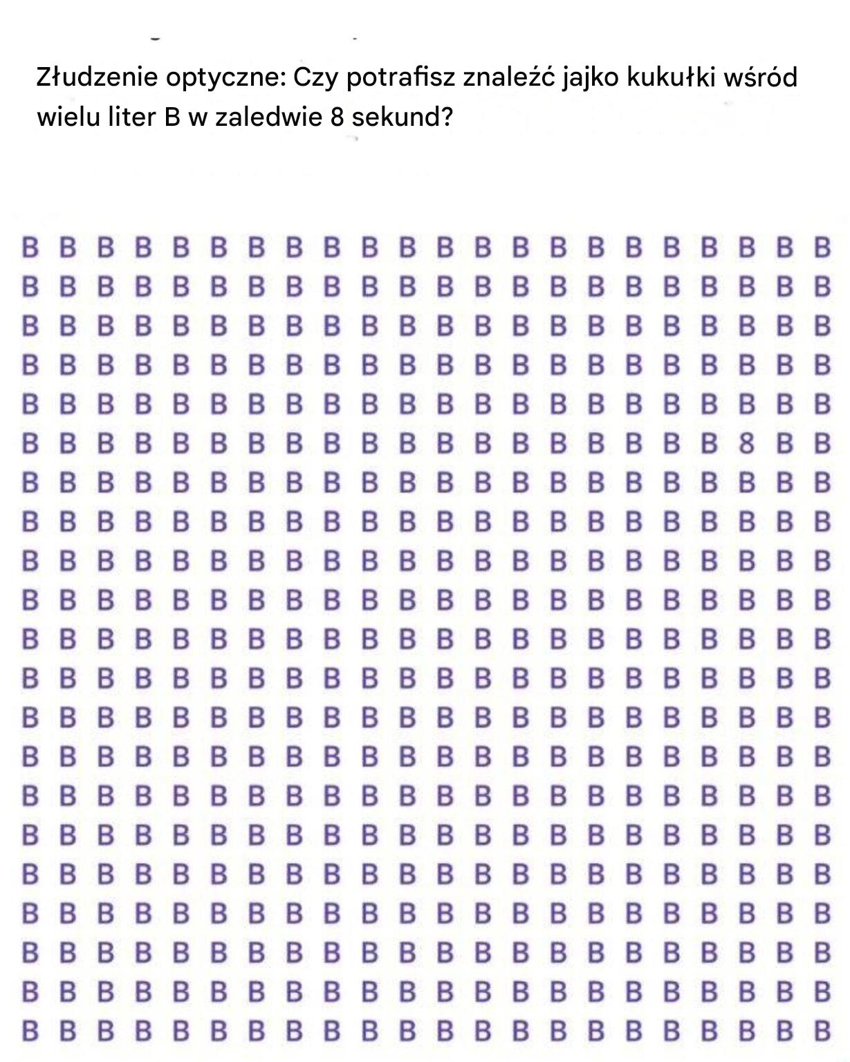 Taka iluzja optyczna to idealny sposób na rozpoczęcie dnia, zwłaszcza jeśli szukasz mentalnej rozgrzewki. Na pierwszy rzut oka wszystko wygląda mniej więcej tak samo, ale jest jeden drobny szczegół, który się wyróżnia. Zadanie wydaje się proste, ale rozwiązanie jest bardziej złożone. Czy jesteś wystarczająco spostrzegawczy, aby je zauważyć w osiem sekund?